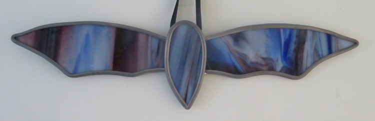 Gary’s fun bats are made from three pieces of hand-cut glass, held together with lead came, and each bat unique. The bat is equally at home in a window or against a wall.
