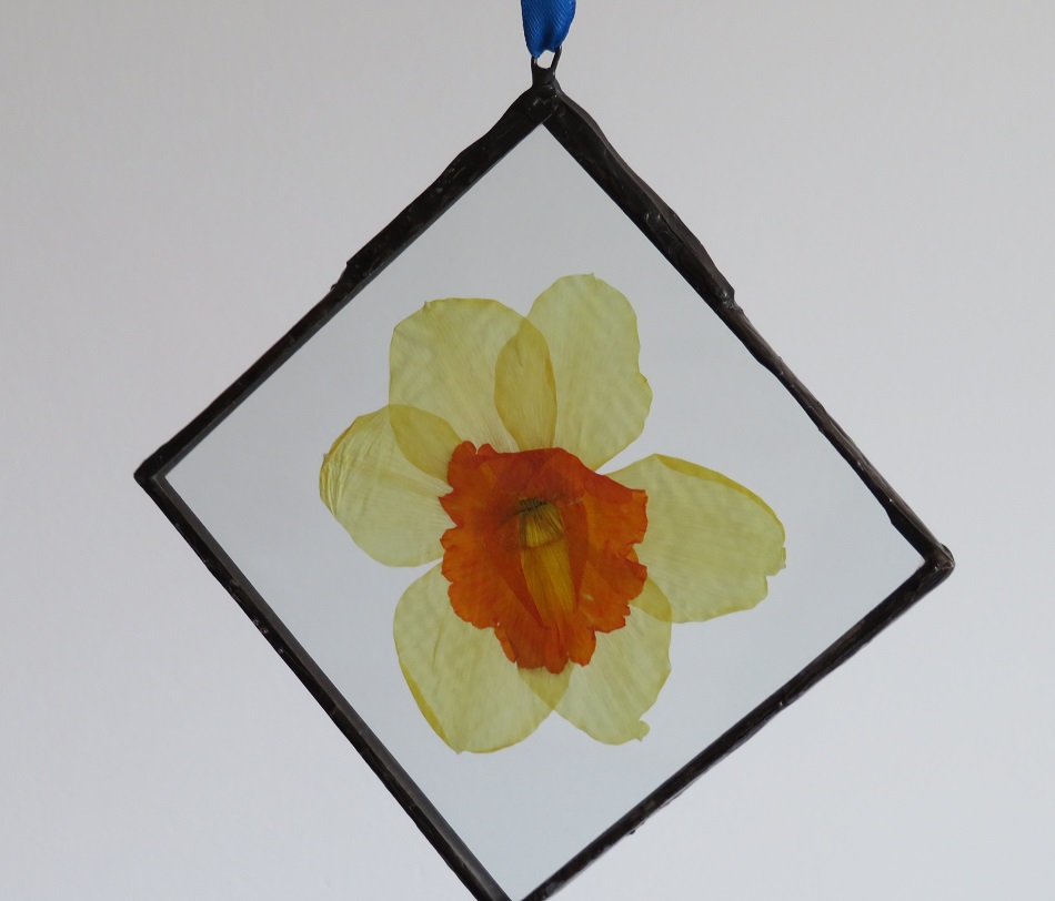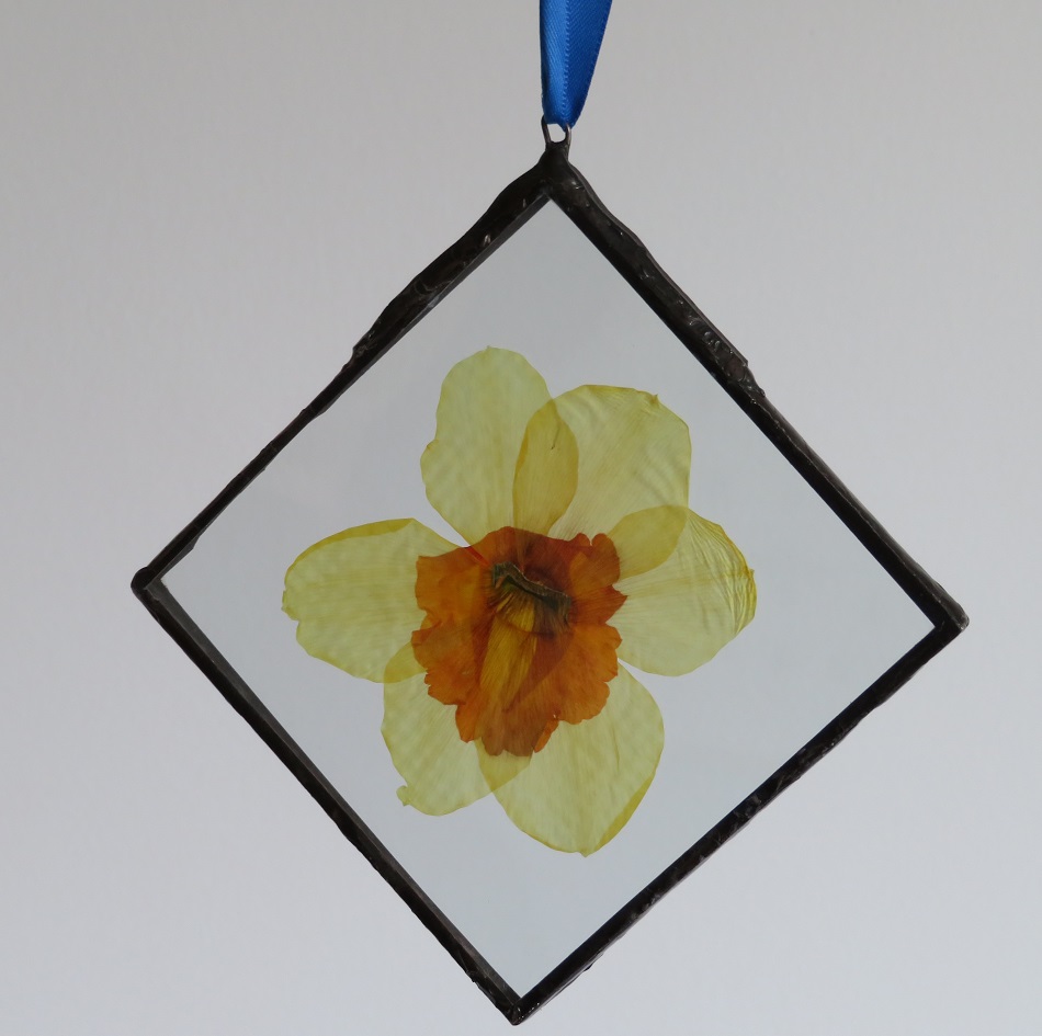 Daffodil in a rhombus is created from hand cut clear glass and framed with lead solder and is hung from a blue ribbon from the top corner. A permanent reminder of springs past and springs yet to come.