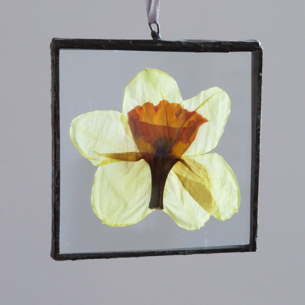 Daffodil in a square is created from hand-cut clear glass, framed with lead solder, and hung from a blue ribbon from the top edge.